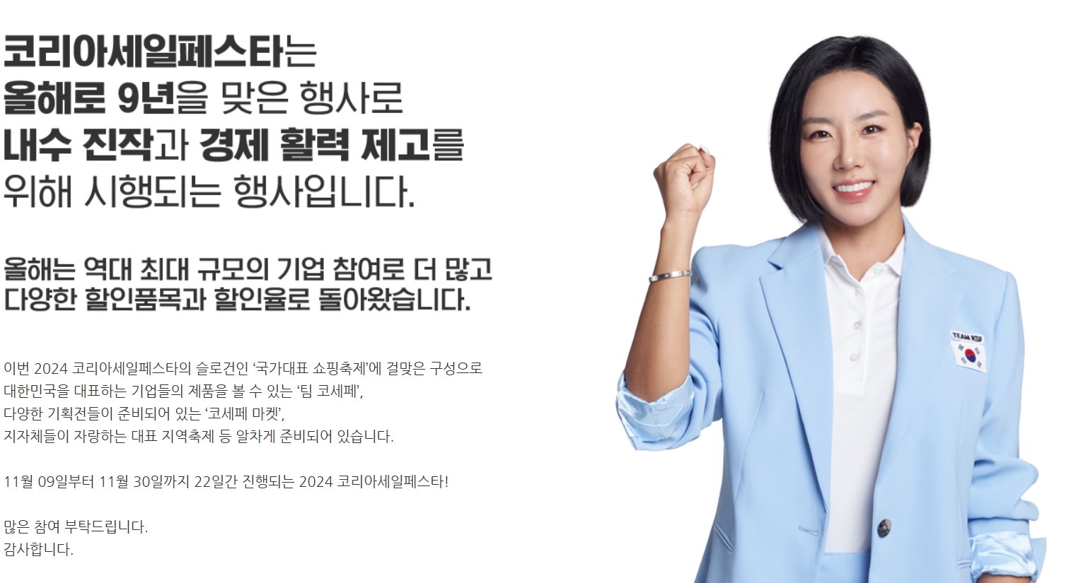2024년 코리아세일페스타는 11월 9일(토)부터 11월 30일(토)까지 총 22일간 공식 개최됩니다.
