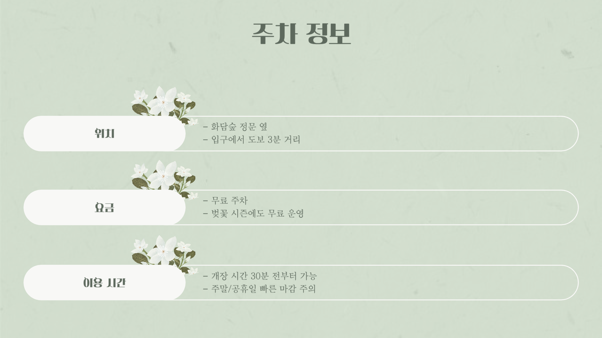 - 주차 가능 시간: 개장 시간 전 30분부터 가능