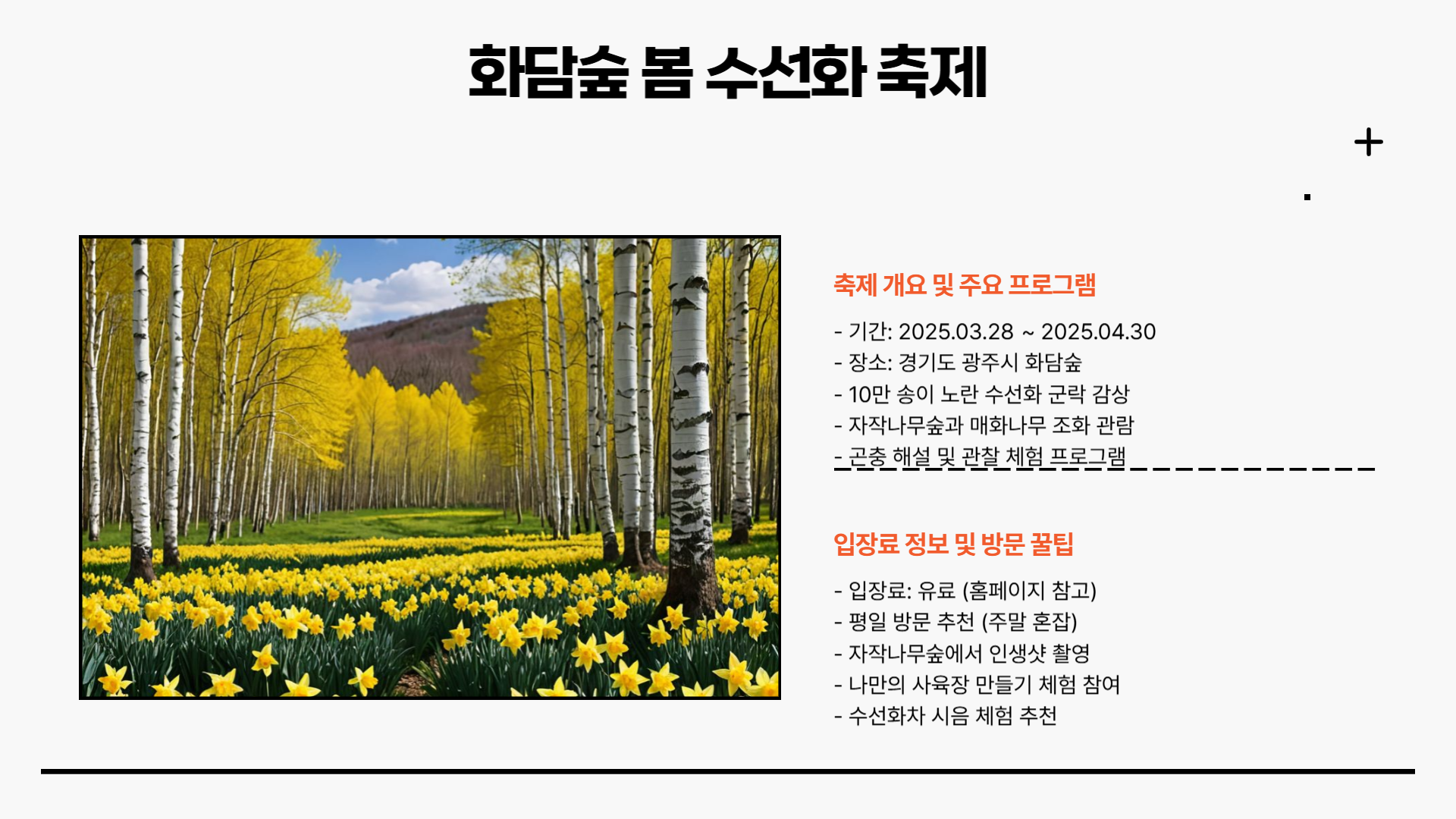 💡 TIP: 주말에는 사람이 많으니 평일 방문 추천! 자작나무숲에서 수선화와 함께 찍은 사진은 인생샷 보장 📸