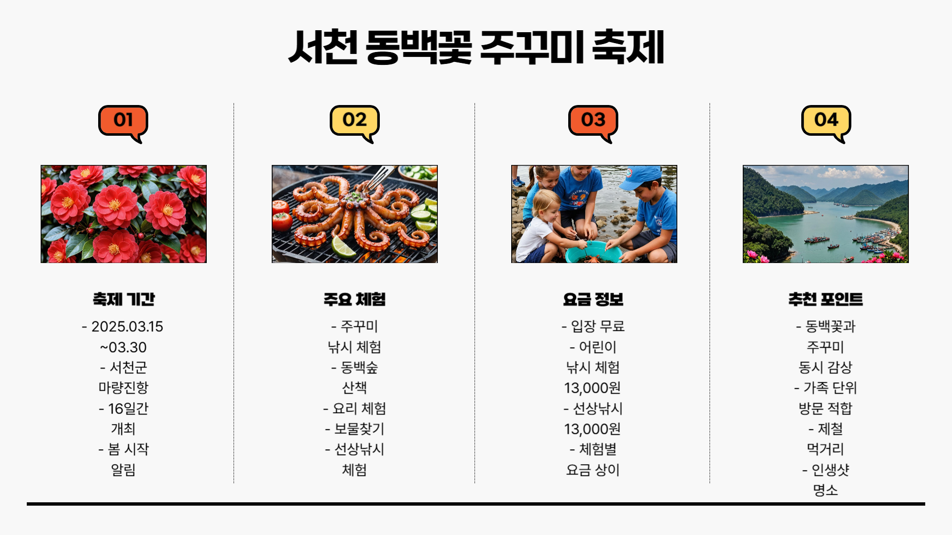 - 어린이와 함께 즐길 수 있는 낚시 체험, 쭈꾸미 요리 장터 등 가족 단위 방문객에게 추천!