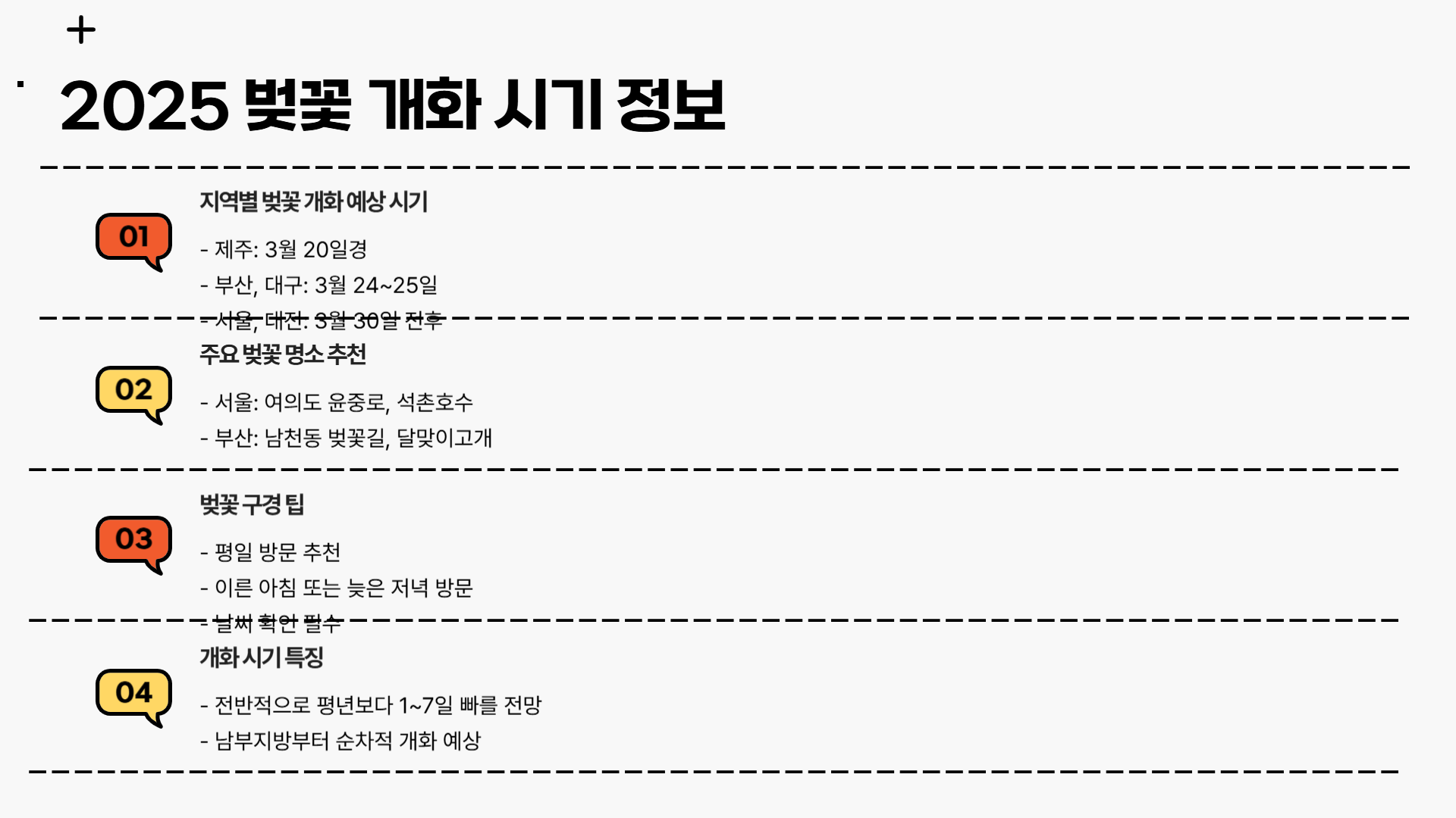 드디어 기다리던 봄이 찾아옵니다!올해는 겨울이 길었던 만큼 벚꽃이 조금 늦게 필 예정인데요. 어디에서, 언제 벚꽃이 필지 궁금하신가요?2025년 벚꽃 개화 시기와 절정 시기를 한눈에 정리해